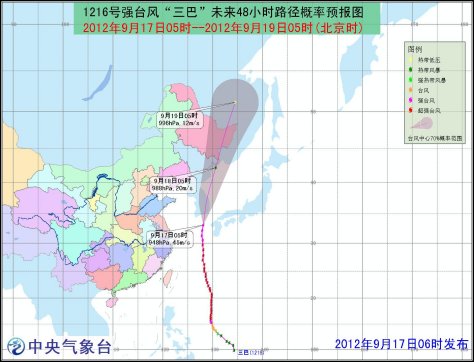 今年第16號(hào)超強(qiáng)臺(tái)風(fēng)“三巴”于昨日(16日)20時(shí)減弱為強(qiáng)臺(tái)風(fēng),今晨5時(shí),中心附近最大風(fēng)力有14級(jí)(45米/秒),中心最低氣壓為948百帕。預(yù)計(jì)“三巴”將于17日中午前后登陸,登陸地點(diǎn)鎖定在韓國(guó)南部一帶沿海,強(qiáng)度逐漸減弱。受“三巴”影響,東北地區(qū)中東部將有中到大雨,部分地區(qū)有暴雨。