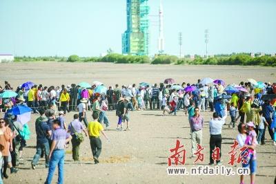 、俑瓯诟沟,藍(lán)天下,發(fā)射塔內(nèi)的神舟十號(hào)飛船和長(zhǎng)征2F遙十火箭組合體揭開其神秘的面紗,航天城的居民、各路記者以及嘉賓游客云集于此,目睹這載入歷史的一刻。