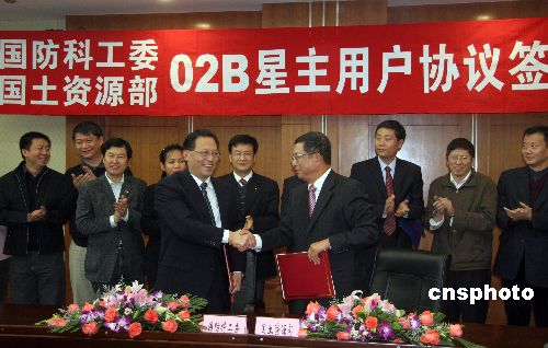 國(guó)防科工委副主任兼國(guó)家航天局局長(zhǎng)孫來(lái)燕、國(guó)土資源部副部長(zhǎng)李元代表雙方簽署《國(guó)防科工委、國(guó)土資源部關(guān)于中巴地球資源衛(wèi)星○二B星主用戶機(jī)制試點(diǎn)的協(xié)議》。