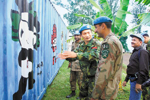 為了宣傳奧運,維和官兵在營院里面制作了各種各樣的奧運標志。充作庫房的集裝箱上噴繪的是福娃的形象,草坪中的一片空地上,則是官兵們用簡易器材做成的五環(huán)圖案和“Beijing2008”字樣。作戰(zhàn)組參謀張寶軍向前來參觀的外國友人一一作著介紹,還特別介紹了奧運會會徽標志代表的里程碑、承諾、形象、美麗、英雄、精神、邀請等七層含義。當?shù)亟逃齾f(xié)會的阿里特邊聽邊記,還將中國印和五個福娃的形狀畫了下來。聯(lián)剛團志愿者部門的卡爾松則連聲說,要調整假期到北京去看奧運會比賽……
