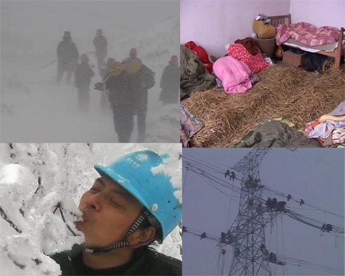 1月23日,在江西和湖北交界處三座相連的500千伏線塔幾乎同時倒塌,湖北省輸變電工程公司的搶修人員爬了三個小時陡峭的山路才趕到了海拔1000米的雪山上,鐵塔已經被徹底摧毀,扭成一團,這是江西和華中電網相連的主要通道,威脅到江西全省的用電。