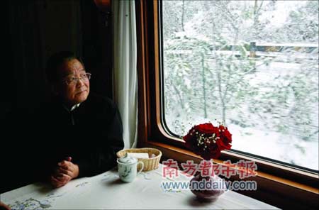 武漢當(dāng)時氣溫在零下,下著小雪,溫家寶直接從機(jī)場去火車站。鐵道部臨時調(diào)派的火車還沒到位,總理只好在火車站貴賓室等待。