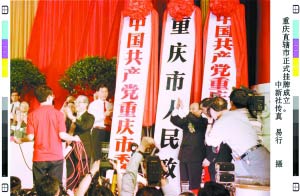 當(dāng)時沒有媒體直播這個場景,但喜訊立刻通過手機(jī)傳到重慶,電話那端響起鞭炮聲。重慶街頭很快掛出標(biāo)語:“我們直轄了!”