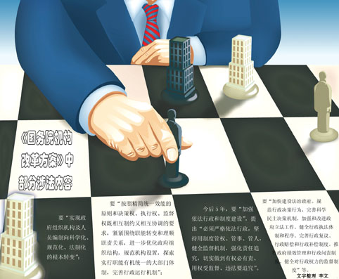 比如,要“實現(xiàn)政府組織機構及人員編制向科學化、規(guī)范化、法制化的根本轉變”;要“按照精簡統(tǒng)一效能的原則和決策權、執(zhí)行權、監(jiān)督權既相互制約又相互協(xié)調(diào)的要求,緊緊圍繞職能轉變和理順職責關系,進一步優(yōu)化政府組織結構,規(guī)范機構設置,探索實行職能有機統(tǒng)一的大部門體制,完善行政運行機制”……