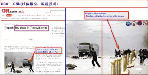其一是“以偏概全,混淆視聽”。3月17日,CNN和法新社在各自網站上使用了同一張圖片,圖中兩輛綠色卡車一前一后正向兩名平民駛來——事實上,如果完整展示圖片的話,可以看到當時軍車旁有約10名暴徒在向軍車投擲石塊,雖然CNN網站的圖片說明寫的是“藏人向軍車投擲石塊”,但圖中卻看不見這一已被裁去的場景。