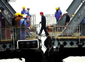 為保證外白渡橋移橋過(guò)程中橋梁結(jié)構(gòu)安全,移橋工作將分南、北兩跨分次進(jìn)行。今天上午先移除南跨橋體,明后天移除北跨橋體。昨天下午,負(fù)責(zé)“移橋”的千噸駁船已進(jìn)入金山路閘橋,?客獍锥蓸蛏嫌。今天上午9時(shí)10分,兩艘拖船將駁船拖至外白渡橋南跨橋體正下方,截至上午10時(shí),駁船已開(kāi)始頂升橋體。