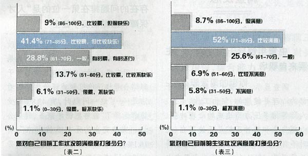 調(diào)查顯示,盡管大多數(shù)中青年干部的心理是健康的,但由工作、生活、人際等諸多壓力而造成的心理沖突、心理失衡和精神壓抑是無處不在、無時不有的。受訪者在回答“如果您覺得活得很累,您認(rèn)為您的壓力主要來自哪些方面?”這一問題時,選擇最多的前三項分別是“工作責(zé)任心太強(qiáng),追求完美之累”,“工作負(fù)荷重,疲于奔命之累”,“迎合領(lǐng)導(dǎo)出政績,失去自我之累”,選擇比例分別達(dá)到了51.3%,34.7%和29.2%,而選擇“交際太繁,苦于應(yīng)酬之累”,“前程靠人恩賜,職場非正常競爭之累”的各占20.3%,并列排在第四位,最后依次是“家庭負(fù)擔(dān)重,子女入學(xué)就業(yè)之累”,占12.9%,“與同事、朋友比心理不平衡之累”,占5.9%,以及“多種壓力”等,占2.6%。
