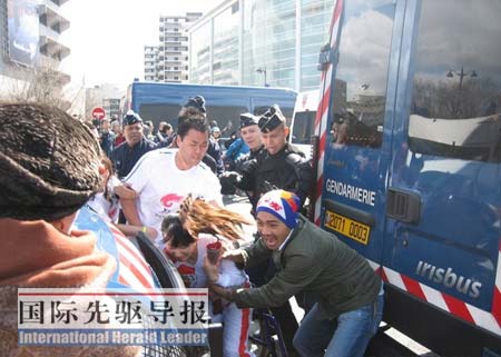 本報(bào)記者親眼看到,一個(gè)“藏獨(dú)”分子突然跳進(jìn)安全防護(hù)欄,旁邊的法國(guó)警察眼疾手快,迅速把他按倒在地,然后扔出了安全防護(hù)欄。即使遇到一些政客出來(lái)挑事,警察也同樣不會(huì)客氣。據(jù)英國(guó)《衛(wèi)報(bào)》記者記述,一個(gè)巴黎市綠黨議員在火炬接力開(kāi)始時(shí)突然表示抗議,很快被警察請(qǐng)了出去。