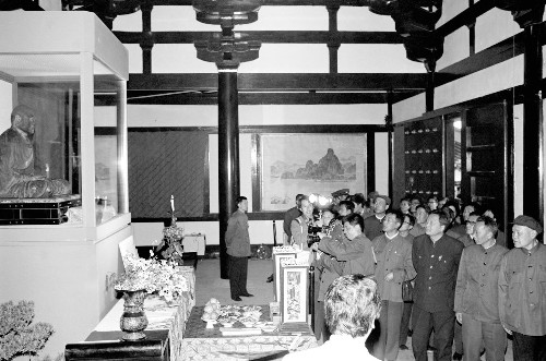 建于公元1688年的御影堂內(nèi),供奉著鑒真乾漆夾造的坐像,高2尺7寸,面向西方,雙手拱合,結(jié)跏跌坐,團(tuán)目含笑,兩唇緊斂,表現(xiàn)鑒真于公元763年圓寂時的姿態(tài),已被定為日本國寶,每年只開放3天供人瞻仰。日本著名畫家東山魁夷為御影堂繪制的68幅屏障壁畫,有《云影》、《濤聲》、《黃山曉云》、《揚(yáng)州薰風(fēng)》、《桂林月宵》和《瑞光》等。