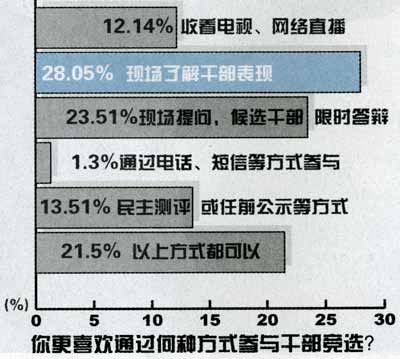 “如果條件許可,你更喜歡通過(guò)何種方式了解和參與干部競(jìng)選?”調(diào)查結(jié)果顯示,“到演講答辯現(xiàn)場(chǎng),全面了解干部現(xiàn)場(chǎng)反應(yīng)”、“現(xiàn)場(chǎng)提問(wèn),并要求候選干部限時(shí)答辯”排在了前兩位,占受調(diào)查者的51.56%。此后是“任前公示或民主測(cè)評(píng)等方式”和“收看電視、網(wǎng)絡(luò)直播”,最不愿意采用的方式是電話或短信方式。也有部分受調(diào)查者表示以上形式都可以。記者隨機(jī)采訪的部分市民紛紛表示:“如果條件許可,我們?cè)敢獾浆F(xiàn)場(chǎng)!