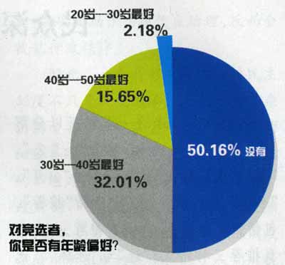 年齡偏好。就年齡而言。50.16%的受調(diào)查者表示對(duì)受調(diào)查者沒(méi)有年齡偏好。但在對(duì)競(jìng)選者進(jìn)行年齡段劃分,20歲至50歲每十歲為一個(gè)年齡段時(shí),顯示出相對(duì)而言群眾更加看好30到40歲的參選者!吧綎|驚現(xiàn)‘80后’廳官!”“史上最牛公務(wù)員!”近日,共青團(tuán)山東省委副書(shū)記,現(xiàn)年28歲的張輝成了網(wǎng)絡(luò)紅人,引起社會(huì)廣泛關(guān)注。實(shí)際上,如果單就年齡而言,這并非稀罕事。河北省代省長(zhǎng)胡春華是中國(guó)最年輕的省長(zhǎng),其仕途路上一直都是最年輕干部,27歲任副廳,29歲當(dāng)正廳。據(jù)相關(guān)披露,若非因太年輕,24歲就是副廳。 (執(zhí)筆:人民論壇記者 艾 蕓)