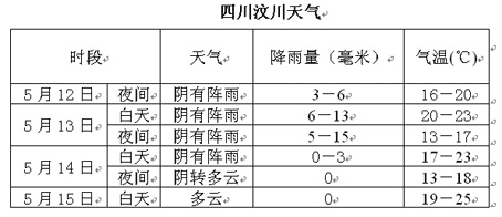 其他受到汶川地震波及的地區(qū),重慶13日20時至15日20時,將有陣雨或雷陣雨,雨量以小到中雨為主。
