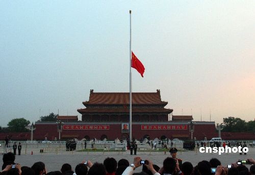 中新網北京5月19日電 五月十九日凌晨四時五十七分四十秒,北京天安門廣場下半旗,沉痛哀悼在汶川特大地震中的遇難者。