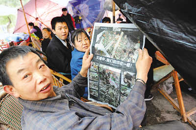 綿陽安縣人民公園安置點,為災區(qū)群眾提供了最新的報紙。(王科/攝)