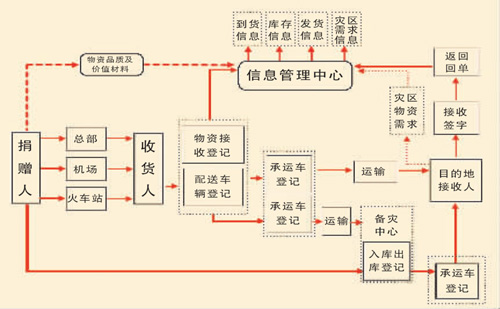 非常時(shí)期,物資調(diào)配十萬(wàn)火急。在不延誤救援的前提下,中國(guó)紅十字會(huì)打破常規(guī),震災(zāi)初期根據(jù)災(zāi)區(qū)所需隨收隨出,但仍然盡可能嚴(yán)格規(guī)程。在洪俊嶺的辦公桌上,一張“四川省紅十字會(huì)救災(zāi)物資信息管理流程”清晰地標(biāo)出從捐贈(zèng)、收貨、物資配送和承運(yùn)、備災(zāi)中心入庫(kù)和出庫(kù)、目的地接收、返回回單等重要環(huán)節(jié)。