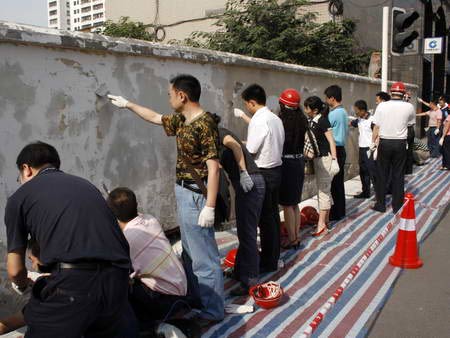 6月3日清晨的成都市繁華中心鹽市口國際商場圍墻邊,成都錦江區(qū)四大班子領(lǐng)導(dǎo)、機(jī)關(guān)干部、各街道辦黨政主要負(fù)責(zé)人在區(qū)委書記周思源和區(qū)長張濟(jì)環(huán)帶領(lǐng)下,正認(rèn)真地粉刷著圍墻。四川新聞網(wǎng)記者獲悉,作為清潔城市大行動的一個部分,錦江區(qū)將根據(jù)創(chuàng)建成都市最清潔城區(qū)的目標(biāo),從即日起在全區(qū)范圍內(nèi)展開粉刷圍墻行動。