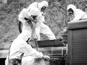 今天(22日),成都軍區(qū)某集團軍防化團又一次在北川縣城進行洗消。與以往不同的是,官兵穿著的防護服由原來的淺綠色變成了白色。據(jù)該集團軍防化團團長謝志榮介紹:“除了顏色不同外,新一代防護服既具有以前防護服的功能,還具有透濕、抗靜電、抗皮膚刺激、耐洗消、物理機械性能好等特點,可長時間穿著和作戰(zhàn)!