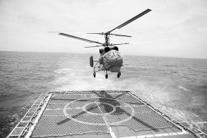 反潛直升機(jī)離艦搜索目標(biāo)。 本報(bào)記者 孫陽攝