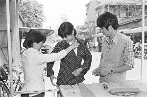 1985年6月,成都經(jīng)濟(jì)體制改革中第三產(chǎn)業(yè)發(fā)展很快,圖為街上的個(gè)體縫紉攤。