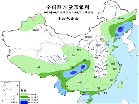 2008年8月12日8時-8月13日8時全古偶降水量預(yù)報圖