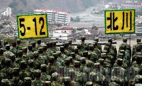 14時(shí)28分,某鐵血師選擇了這個(gè)時(shí)間,在北川縣城奏響哀樂,上萬響鞭炮同時(shí)鳴響。512名某鐵血師官兵,面朝北川,默哀、鞠躬、告別。“沉痛哀悼北川遇難同胞”的橫幅掛起,軍人們雙手折出來的花朵,編織出兩塊巨大的牌匾,上面寫著“5·12”、“北川”。哀樂響起,官兵默然,每個(gè)人胸前別著的那一朵寫有“哀念”兩個(gè)字的白色紙花,在風(fēng)中輕輕飄揚(yáng)。鞭炮的鳴響漸漸遠(yuǎn)去,戰(zhàn)士們將花圈送到兩塊牌匾之間,該師師長(zhǎng)曲新勇和政委高偉率先捧起黃色雛菊,走到崖邊,眺望著即將離別的北川縣城,不約而同一個(gè)立正,莊嚴(yán)的軍禮獻(xiàn)給遇難同胞。