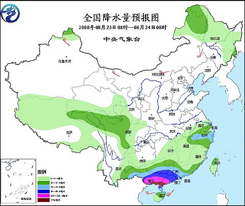 2008年8月23日08時—8月24日08時全國降水量預報圖