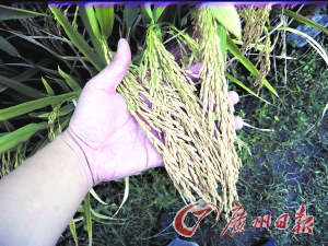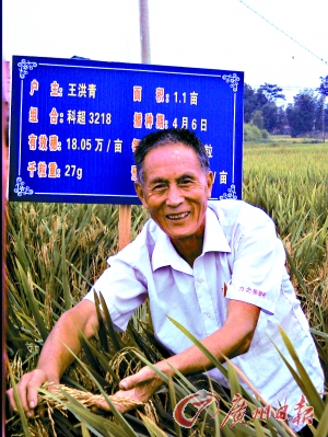 該鄉(xiāng)農技站長鄒都樂介紹說,王洪青種的這種水稻是袁隆平院士新研制的品種“科超3218”,前幾天經(jīng)專家田間現(xiàn)場測產(chǎn),每畝有效穗超過18萬支,平均每穗實粒207粒,按每千粒27克計算,預計今年畝產(chǎn)達到1008公斤!叭绮怀鲆馔,今年牛形嘴村這塊102畝的試驗田,平均畝產(chǎn)將鐵定突破900公斤。”鄒都樂說,村里去年就開始種上袁院士的這種超級稻,去年8月份,眼看長勢喜人的水稻即將割鐮,可惜突然來了一場“圣帕臺風”,一夜之間將水稻刮倒許多。最后收割時一測算,畝產(chǎn)只有870公斤!叭绻麤]有那場臺風,畝產(chǎn)900公斤的目標去年早就提前實現(xiàn)了!”