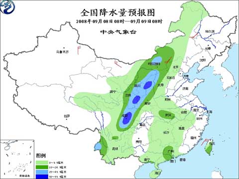 2008年9月8日8時(shí)-9日8時(shí)全國降水量預(yù)報(bào)圖