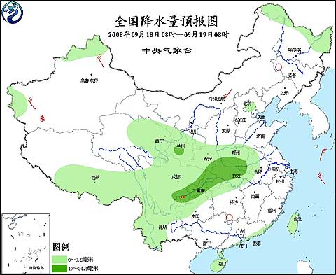 2008年9月18日8時—9月19日8時全國降水量預報圖