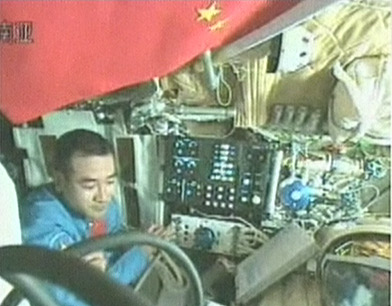 據(jù)報道,在神七傳回的艙內(nèi)畫面顯示,軌道艙內(nèi)航天員正在組裝航天服,艙內(nèi)有一面紅色的旗幟,經(jīng)確認(rèn)過這是一面五星紅旗。