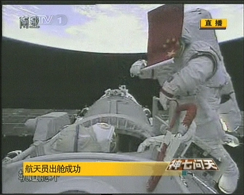 中新網(wǎng)9月27日電 神七航天員翟志剛北京時(shí)間16:43分順利出艙,劉伯明剛才將國旗遞給翟志剛,翟志剛將五星紅旗在太空中揮動(dòng)。目前,航天員出艙10多分鐘。