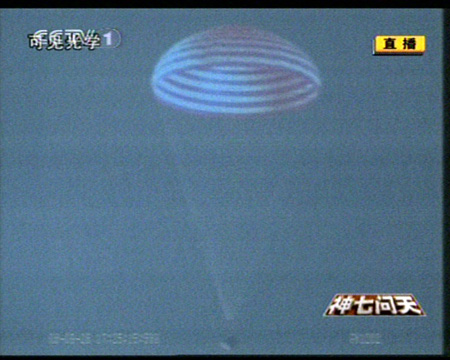 中新網(wǎng)9月28日電 神舟七號飛船返回艙主降落傘打開。北京飛控中心大廳里響起掌聲。