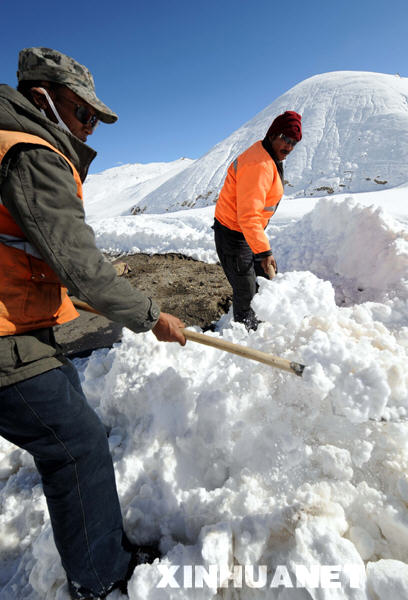 10月30日,西藏錯那縣養(yǎng)護段三工區(qū)的養(yǎng)路工人在清理公路積雪。新華社記者賈立君攝