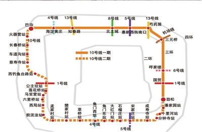 將于下月底動工的10號線二期全長32.46公里,起點為勁松站,終點為巴溝站,全長設(shè)站23座,其中換乘站12座,預計2013年9月30日竣工。屆時它將與已通車的10號線一期組成北京第二條環(huán)線地鐵線路。