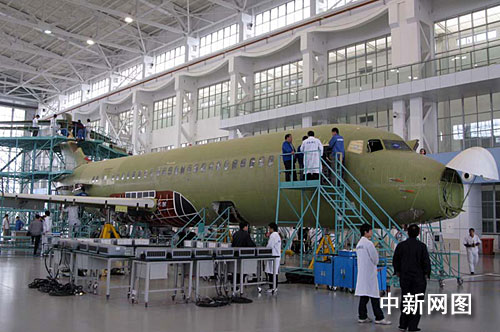 中國商飛上海飛機制造廠ARJ21總裝生產(chǎn)線,科研人員正在總裝ARJ21-700新支線飛機。