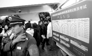 據了解,今年的公務員考試中,北京地區(qū)考生9.5萬人,比去年增加了1.5萬人,北京今年共在全市設立了132個考點、3186個考場。今年,國家公務員考試考錄比例為57比1,較之去年46比1的考錄比例競爭更加激烈,不少參加考試的考生戲稱自己是“炮灰”。