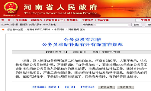 河南省澄清公務員加薪傳聞 稱意在規(guī)范津貼發(fā)放