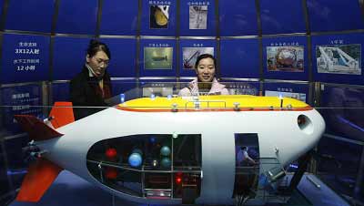 一條可愛的胖魚、卻張開著兩只大手臂,魚肚子里還趴著3個人,這是代表我國深?萍嫉7000米載人深潛器“和諧號”的最新樣機模型,昨天,在同濟亮相的這一海底“神七”通過演示臺展示了其操作原理。