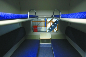 每節(jié)車廂被分割成10個(gè)獨(dú)立包廂,寬敞的包廂里上下鋪共有4張床位,每個(gè)床腳都有獨(dú)立電視,包廂門口還加裝了呼叫系統(tǒng)。將于本月21日首發(fā)的京滬、京杭臥鋪動(dòng)車組,增加了大量人性化設(shè)計(jì)。昨日,本報(bào)記者提前上車探訪了這趟國(guó)內(nèi)最高級(jí)的臥鋪車。