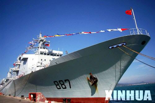 該艦于2003年7月1日黃埔造船廠下水,2004年4月服役,編入南海艦隊(duì)。是我國(guó)自行設(shè)計(jì)建造最大補(bǔ)給艦,艦長(zhǎng)171.4米,寬24.6米,吃水深度9米,排水量23000噸,兩臺(tái)柴油發(fā)動(dòng)機(jī)雙軸驅(qū)動(dòng),可同時(shí)為兩艘以上艦船補(bǔ)給,主要用于遠(yuǎn)洋補(bǔ)給。最大航速19節(jié),續(xù)航力10000/14節(jié)。船員130名,推測(cè)物資容量為燃油10500噸,水250噸,干貨彈藥680噸。裝備4門(mén)76F雙聯(lián)裝37mm 63倍徑機(jī)炮。