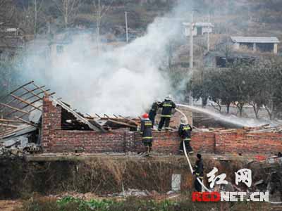 冷水江市巖口鎮(zhèn)農(nóng)科村一鞭炮廠倉庫被炸為廢墟。