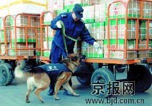 上午9時(shí),4只“犬警官”坐鎮(zhèn)北京西站,在旅客行李房等處忙著緝毒搜爆,還將在廣場(chǎng)、站臺(tái)、垃圾箱、行李房、下水道及各陰暗角落搜查可疑物品。
