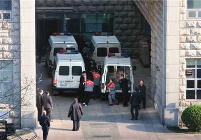 昨天上午8點(diǎn),由4輛囚車組成的車隊(duì)呼嘯而至市二中院,進(jìn)門后徑直開(kāi)到了審判大樓的后面。囚車停穩(wěn)后,趙鵬運(yùn)等28名被告人被逐一帶入暫看室。記者看到,法院院里停了兩輛120急救車,院外,有近20輛警車分布在法院周圍,大批警力在現(xiàn)場(chǎng)維持秩序。