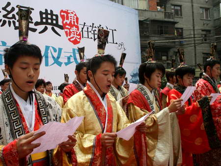 “龍之傳人,天命東方。列祖賜我光榮,蒼天降我大貴。弱冠既加,如之棟梁。道義不辭,大任始承……”3月26日,十八名身穿漢服的成都青年當(dāng)眾完成漢代成人禮,而錦江區(qū)國(guó)學(xué)經(jīng)典誦讀活動(dòng)亦隨即啟動(dòng)。四川新聞網(wǎng)記者獲悉,為倡導(dǎo)轄區(qū)內(nèi)機(jī)關(guān)干部爭(zhēng)讀國(guó)學(xué),錦江區(qū)公開(kāi)發(fā)出倡議,號(hào)召全區(qū)機(jī)關(guān)干部每天關(guān)閉電視或電腦一小時(shí),把時(shí)間用于學(xué)習(xí)國(guó)學(xué)經(jīng)典。