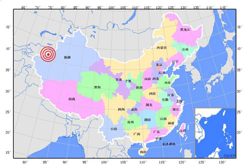 據(jù)測定,地震震中位于北緯四十一點三度, 東經(jīng)七十八點三度。
