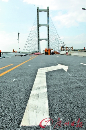 記者來到橋中間的斷橋處,七八名工人正在斜拉橋與舊橋的“接縫”做修復(fù)檢測,負(fù)責(zé)對接施工的陳工告訴記者,從5月28日開始他們?yōu)樾屡f橋連接處施工彌合,昨天凌晨1時,正式為兩處各47米寬的縫隙裝上鋼梁自動伸縮設(shè)備,大橋橋面完全對接貫通無阻。