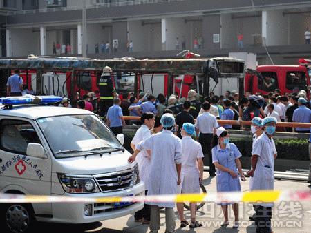 據(jù)中央電視臺(tái)記者介紹,目前,事故公交車已被拖走。記者在現(xiàn)場(chǎng)看到,事故公交車被燒的嚴(yán)重變形,座位全部被燒焦了。事故路段近300米已戒嚴(yán),地上有近30米長(zhǎng)的帶血的腳印。目前現(xiàn)場(chǎng)有群眾圍觀。