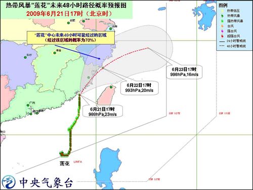 中新網(wǎng)6月21日電 中央氣象臺今天下午六時發(fā)布臺風橙色警報:今年第3號熱帶風暴“蓮花”(LINFA)的中心今天下午5時位于福建省晉江近海海面上,就是北緯24.2度,東經(jīng)118.5度,中心附近最大風力有9級(23米/秒)。預計,“蓮花”將以每小時15公里左右的速度向偏北方向移動,即將在福建晉江附近沿海登陸,登陸后將沿福建中部沿海地區(qū)向北偏東方向移動,強度將很快減弱。