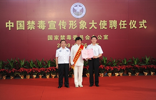 國家禁毒委員會辦公室常務(wù)副主任、公安部禁毒局局長楊鳳瑞為中國禁毒宣傳形象大使成龍頒發(fā)聘書并佩戴綬帶。