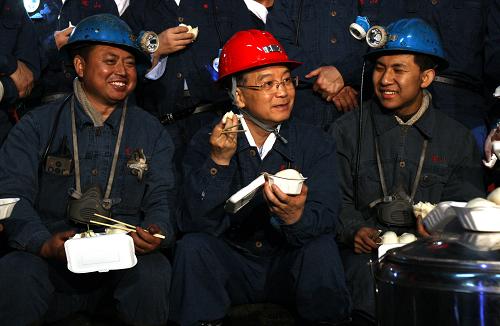 臨近中午12時,從早上7時就下到礦井里工作的工人們要吃中飯了。在巷道里,溫家寶坐在枕木上與工人們一起用餐。他一邊吃飯,一邊詢問工人們的生產(chǎn)生活情況。他對大家說,中國是世界上最大的產(chǎn)煤國,應(yīng)該有世界上最先進(jìn)的礦井、最先進(jìn)的技術(shù)和設(shè)備、最優(yōu)秀的產(chǎn)業(yè)工人。在應(yīng)對國際金融危機(jī)時,一定要把煤炭生產(chǎn)搞好。必須正確處理保增長與安全生產(chǎn)的關(guān)系,任何時候安全生產(chǎn)都是第一位的,在安全生產(chǎn)中實現(xiàn)經(jīng)濟(jì)平穩(wěn)較快增長。同時,要下決定引進(jìn)新技術(shù),大力推進(jìn)清潔生產(chǎn),讓煤炭生產(chǎn)質(zhì)量和效益走在世界的前列。溫家寶在礦井下呆了兩個小時,才與礦工們惜別。